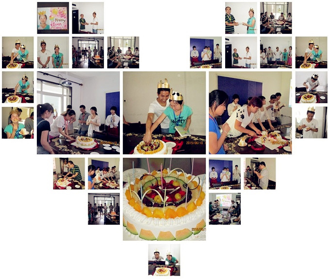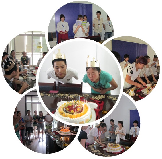 日会上,响起生日歌,寿星们许下较真诚的愿望,全体员工为寿星送上祝福。