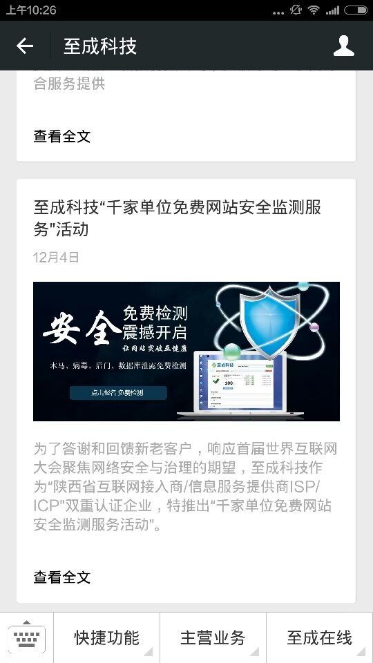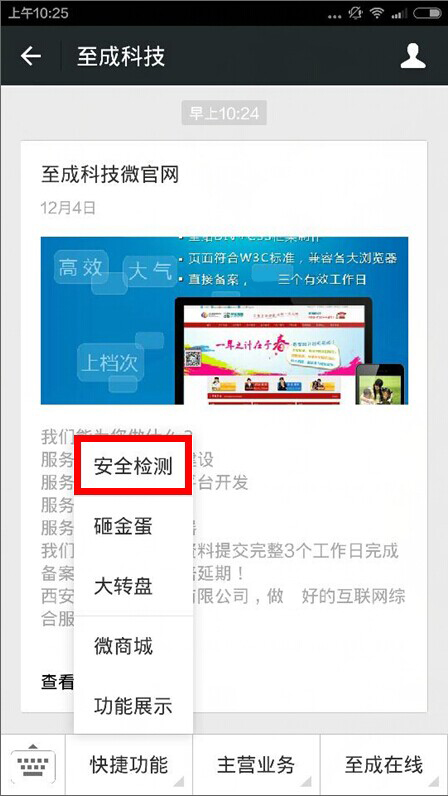1.添加并关注西安至成信息科技有限公司微信公众号wxzcit ,或者扫描下面的二维码。在下面的菜单栏中点击快捷功能-安全检测,或者直接回复关键词“安全检测”,进入到我们此次网站检测的活动页面。