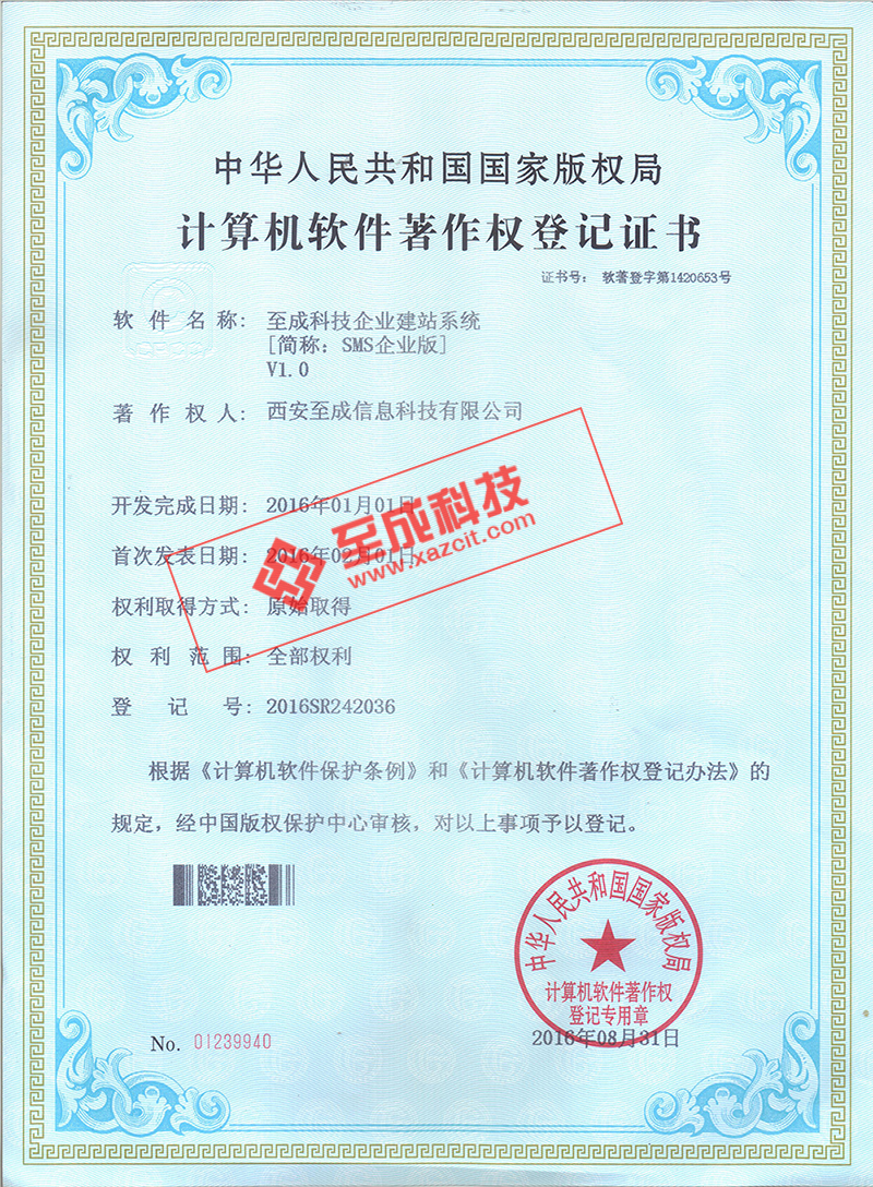 经中华人民共和国国家版权局审核考证,根据《中华人民共和国计算机软件保护条例》和《计算机软件著作权登记办法》的规定:近日西安至成信息科技有限公司被认定为软件——“至成科技企业建站系统[简称:SMS企业版]V1.0”的法定著作权持有人,并于2016年08月31日正式授予《中华人民共和国国家版权局计算机软件著作权登记证书》,登记号为2016SR242036。即日起,其版权将得到“中国版权保护中心”的有效保护。
