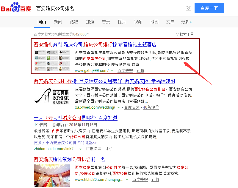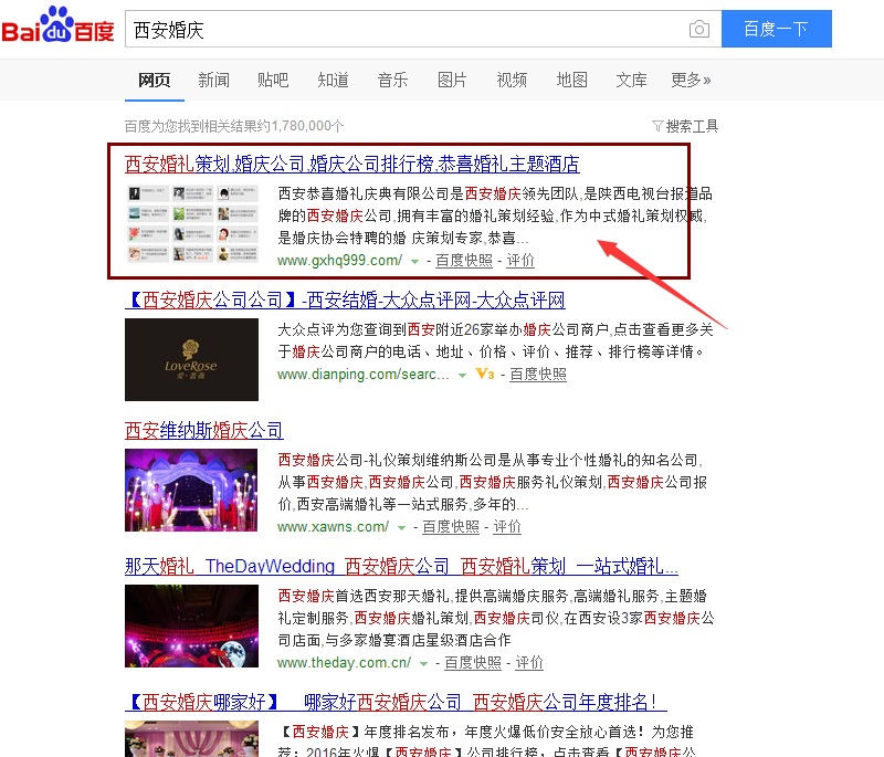 随着竞价推广位置的不断减少,SEO排名显得尤为重要,在此至成科技特意为大家展示近期网站客户SEO推广案例,由至成科技源代码开发建站的西安恭喜婚礼庆典有限公司(以下简称“恭喜婚礼”)官网于2016年7月6日正式上线(www.gxhq999.com),网站上线后客户并没有对网站进行专业SEO优化,搜索引擎自然排名取得的傲娇成绩让人折服。
