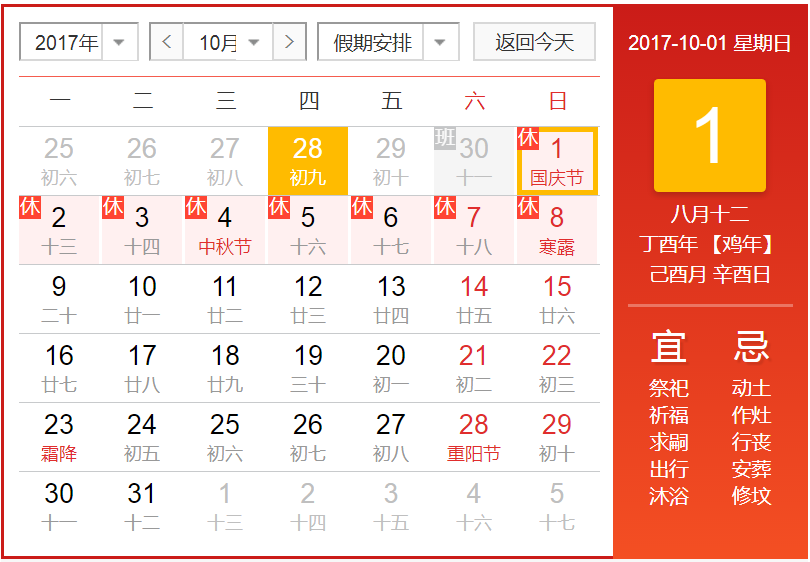 值此中秋、国庆双节来临之际,根据《国务院办公厅关于2017年部分节假日安排通知》和政府办公厅的通知精神,并结合我司实际,现将至成科技2017中秋双节放假时间安排通知如下:9月30日(星期六)上班,10月1日至8日放假调休,共8天,与中秋连休。