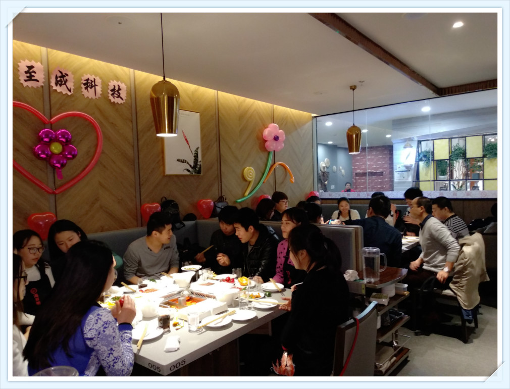 “新年到,新年到”2017年即将过去,新的一年向我们走来,为了庆祝17年取得的成绩,增加公司员工凝聚力,至成科技昨天在海底捞开展“喜迎元旦,共创未来”的聚餐大联欢。这一年我们这个大家庭,一起同心协力,挑战自我,不断超越,2018年我们将更加努力,共创时代辉煌!