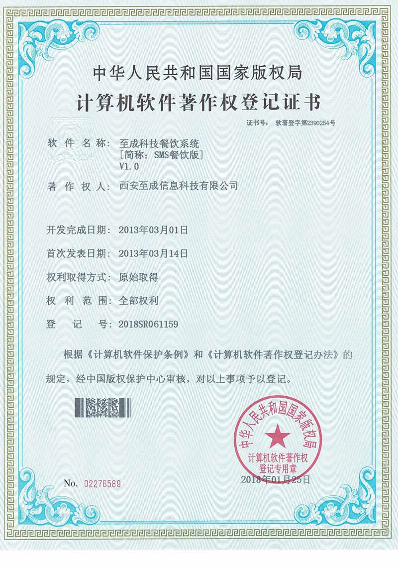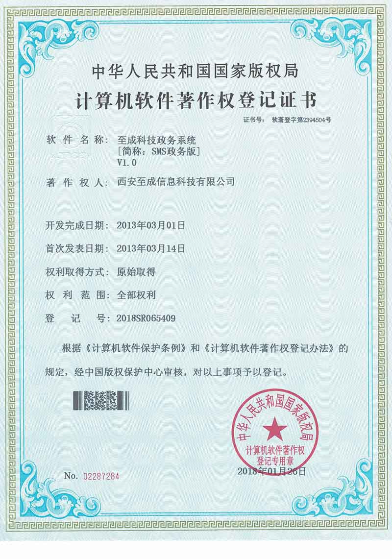 经中华人民共和国国家版权局审核考证,根据《中华人民共和国计算机软件保护条例》和《计算机软件著作权登记办法》的规定:近日西安至成信息科技有限公司被认定为——“至成科技政务系统[简称:SMS政务版]V1.0”和“至成科技餐饮系统[简称:SMS餐饮版]V1.0”的法定著作权持有人,并于2018年01月26日正式授予《中华人民共和国国家版权局计算机软件著作权登记证书》,登记号分别为2018SR065409和2018SR061159。即日起,其版权将得到“中国版权保护中心”的有效保护。